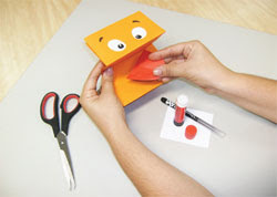Caso deseje confeccionar um fantoche maior, lembre-se de que a cartolina inteira fica pesada. Para que não escorregue dos seus dedos durante a apresentação, cole dois pequenos pedaços de papel crepom no interior das aberturas em que há contato com a ponta dos dedos.